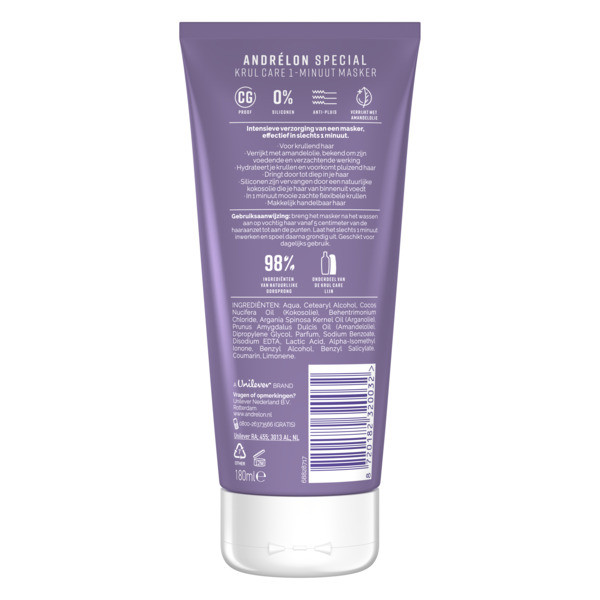 Andrélon Special Krul Care 1 minuut masker voor stralende, zachte krullen. Het masker voor krullend haar is verrijkt met 98% ingrediënten van natuurlijke oorsprong, zoals amandelolie bekend om zijn voedende en verzachtende werking. Het masker dringt door tot diep in het haar om de krullen te hydrateren en pluizend haar te voorkomen. De siliconen zijn vervangen door een natuurlijke kokosolie, die het haar van binnenuit voedt. Het Andrélon Special Krul Care 1 minuut masker zorgt in 1 minuut voor mooie, flexibele krullen en makkelijk handelbaar haar.